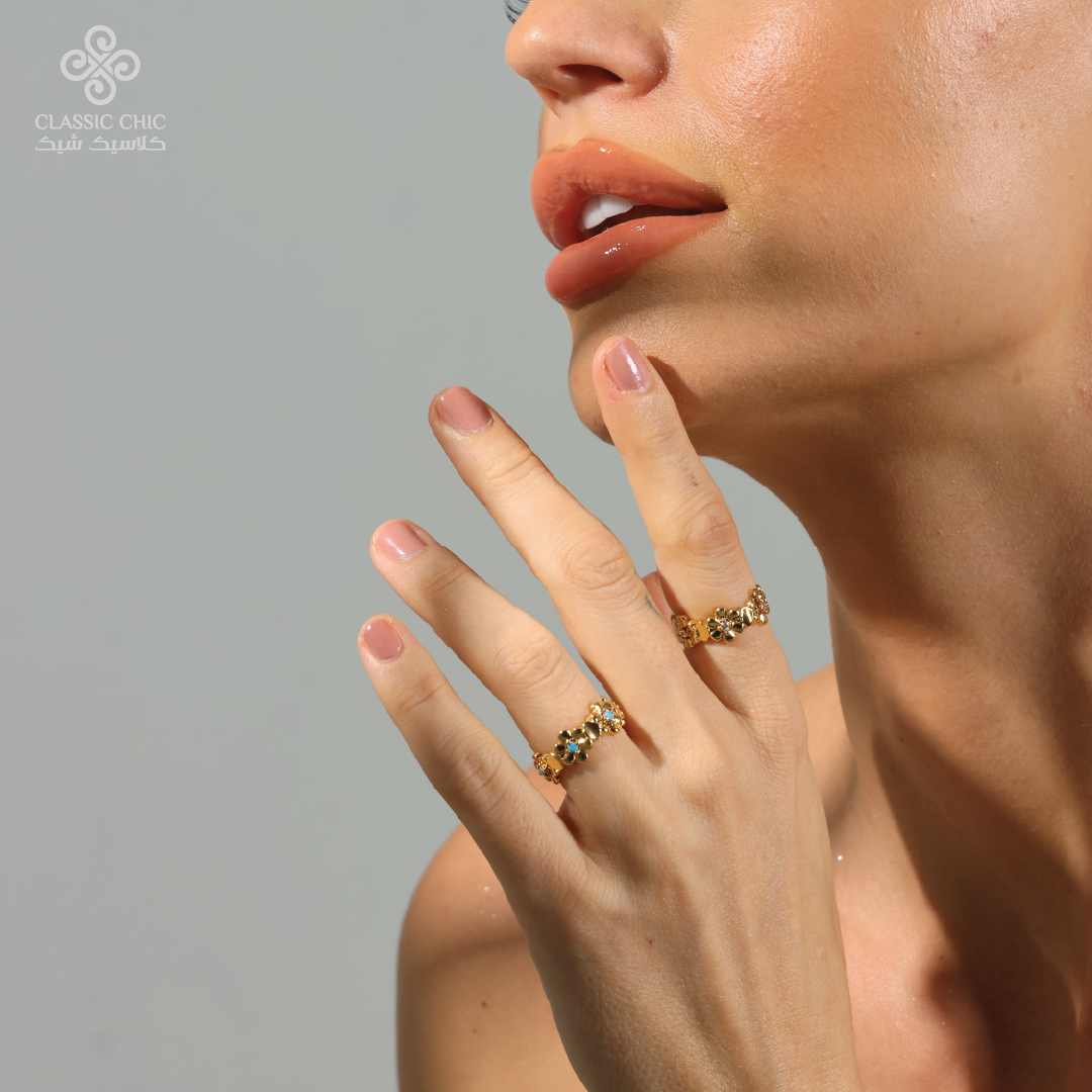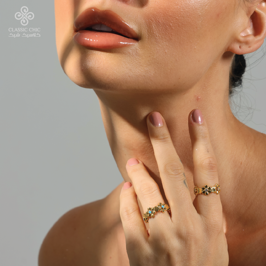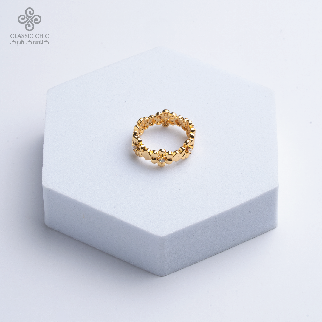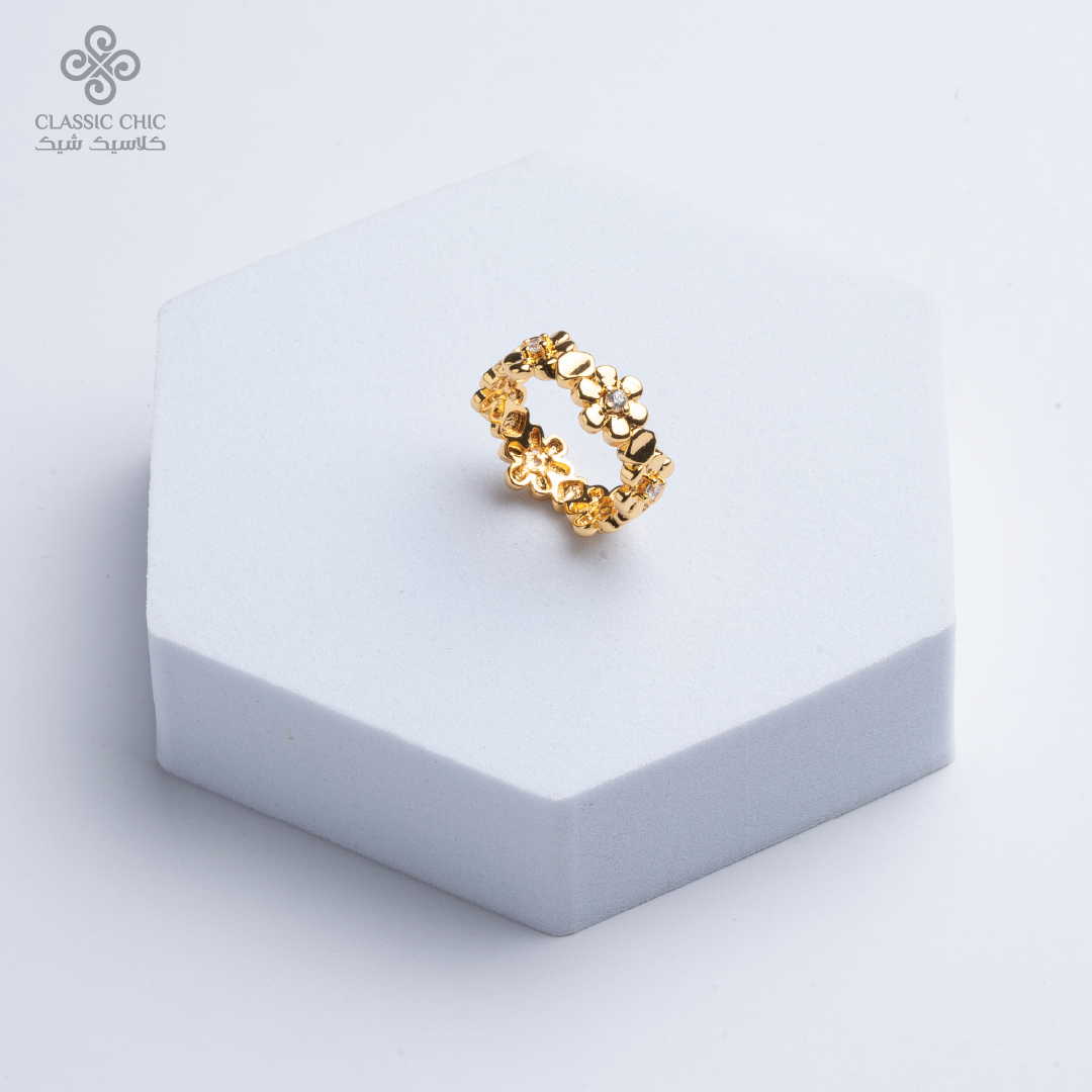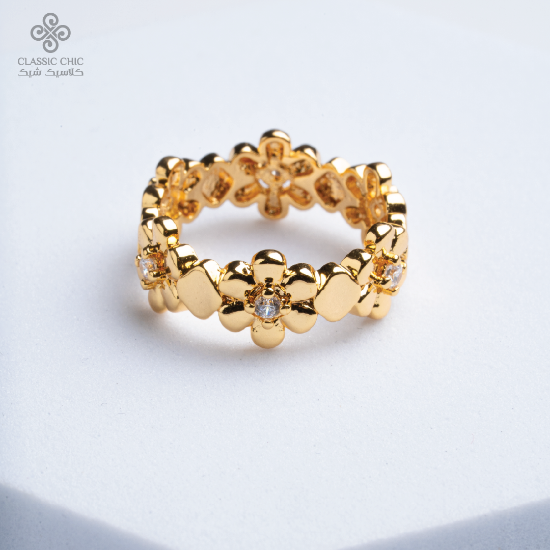خاتم بتصميم زهور ذهبية متناسقة، مزين بلمسات زركون ناعمة تضيف إشراقة رقيقة ولمسة فخامة أنثوية لإطلالتك.