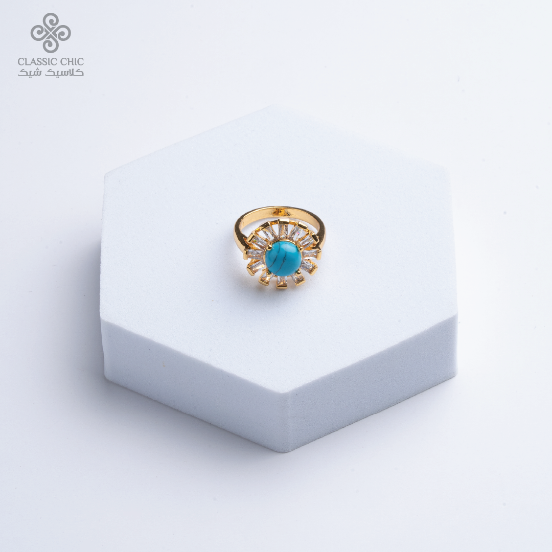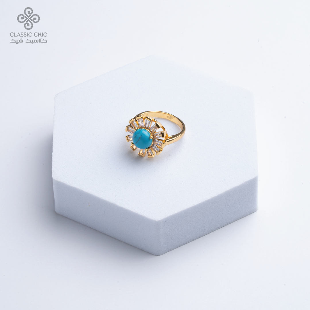 خاتم بتصميم أنيق يتوسطه حجر فيروز جذّاب محاط بأحجار شفافة، يمنحك لمسة فخامة ناعمة تناسب الإطلالات اليومية والمناسبات ✨