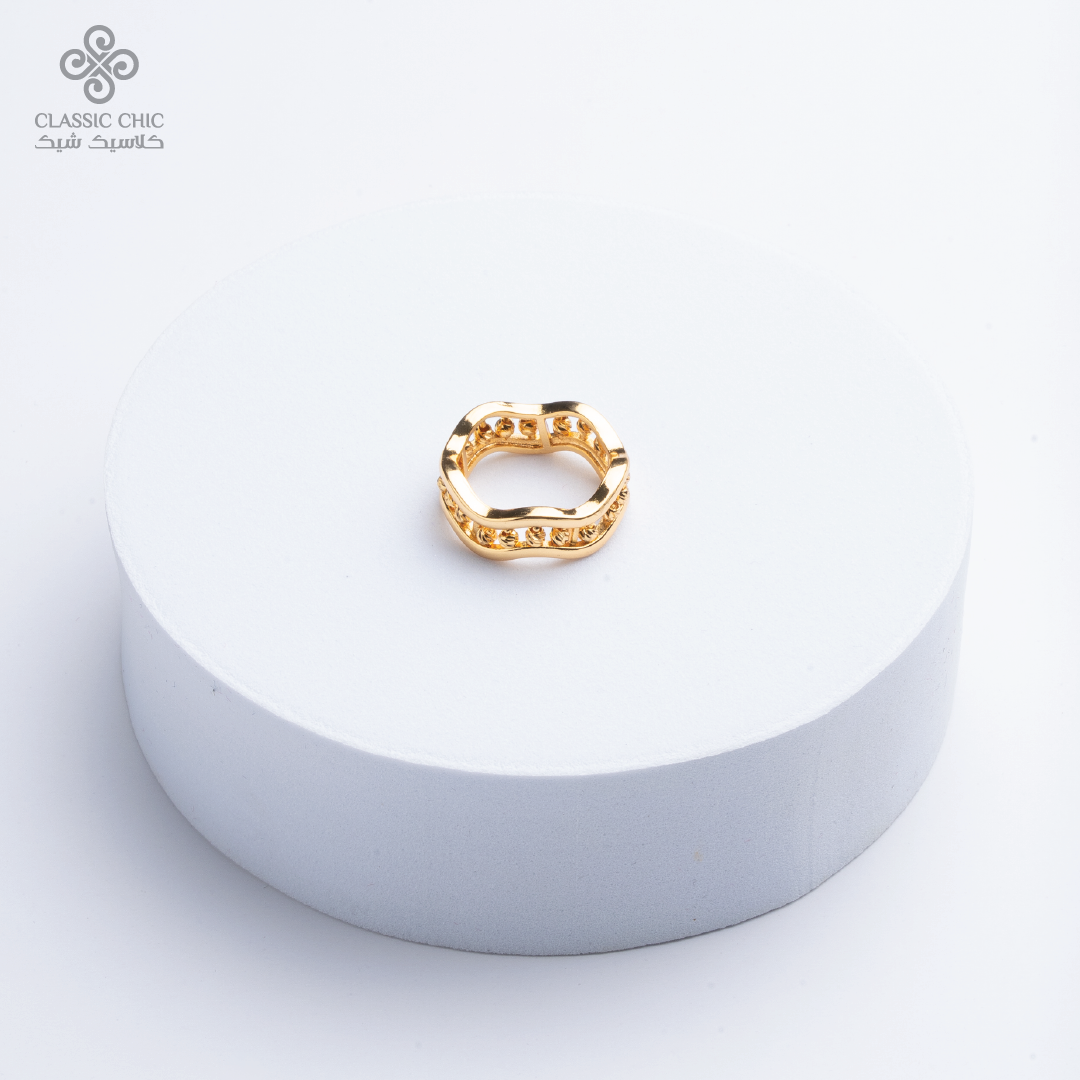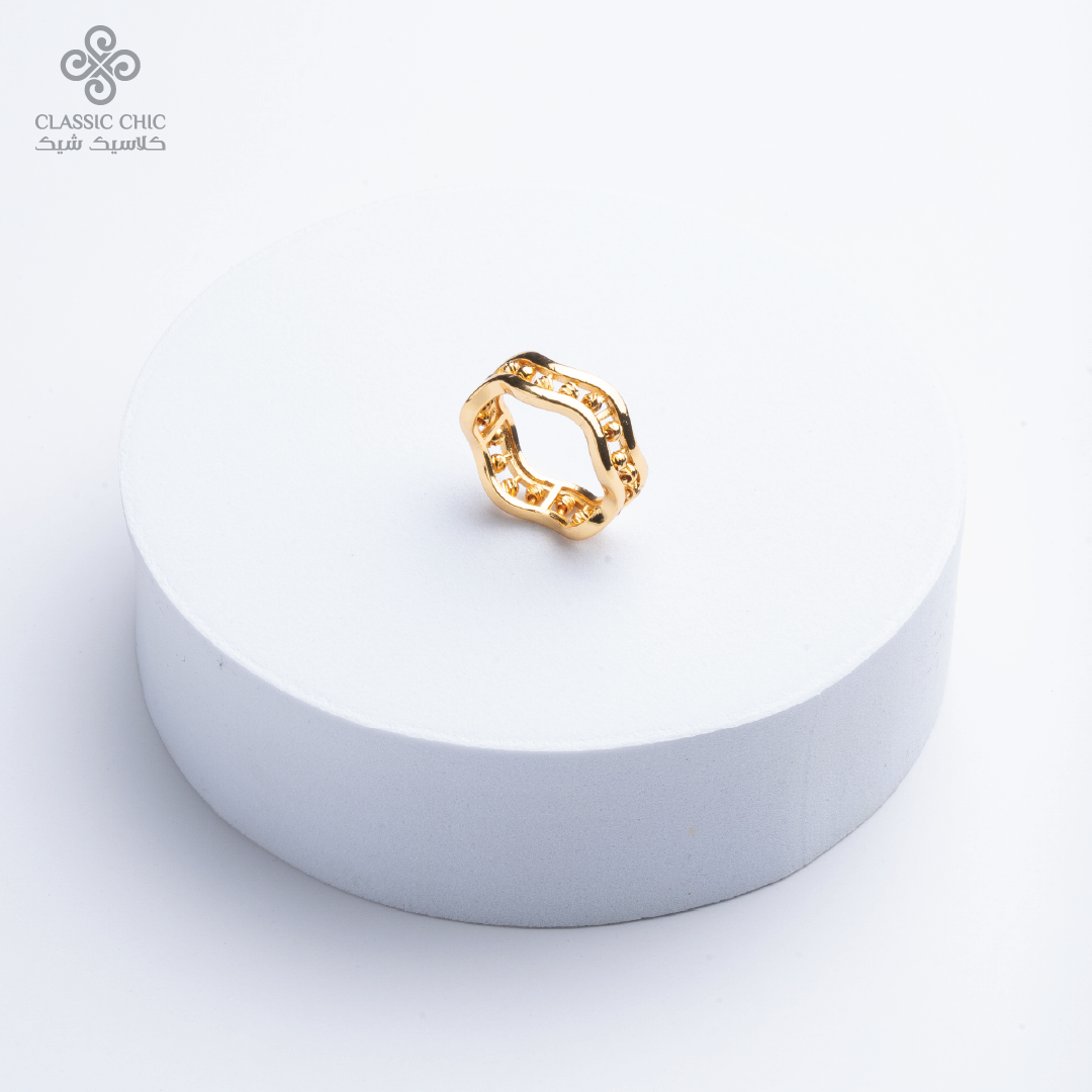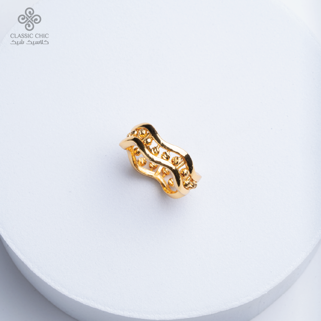 خاتم بتصميم مموّج مزين بكرات ذهبية يضفي لمسة عصرية ناعمة على إطلالتك، سهل التنسيق ومثالي للاستخدام اليومي أو للمناسبات.