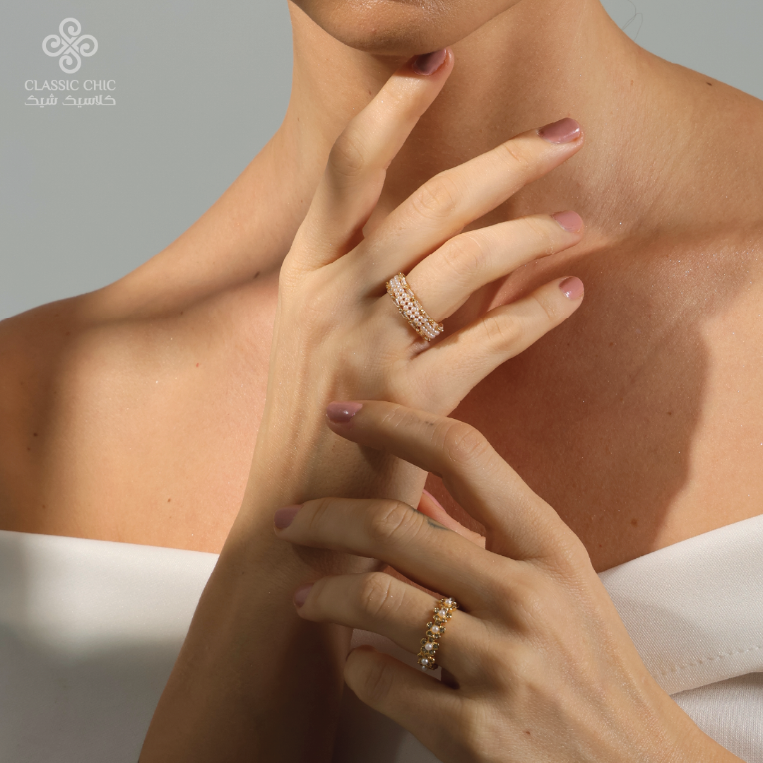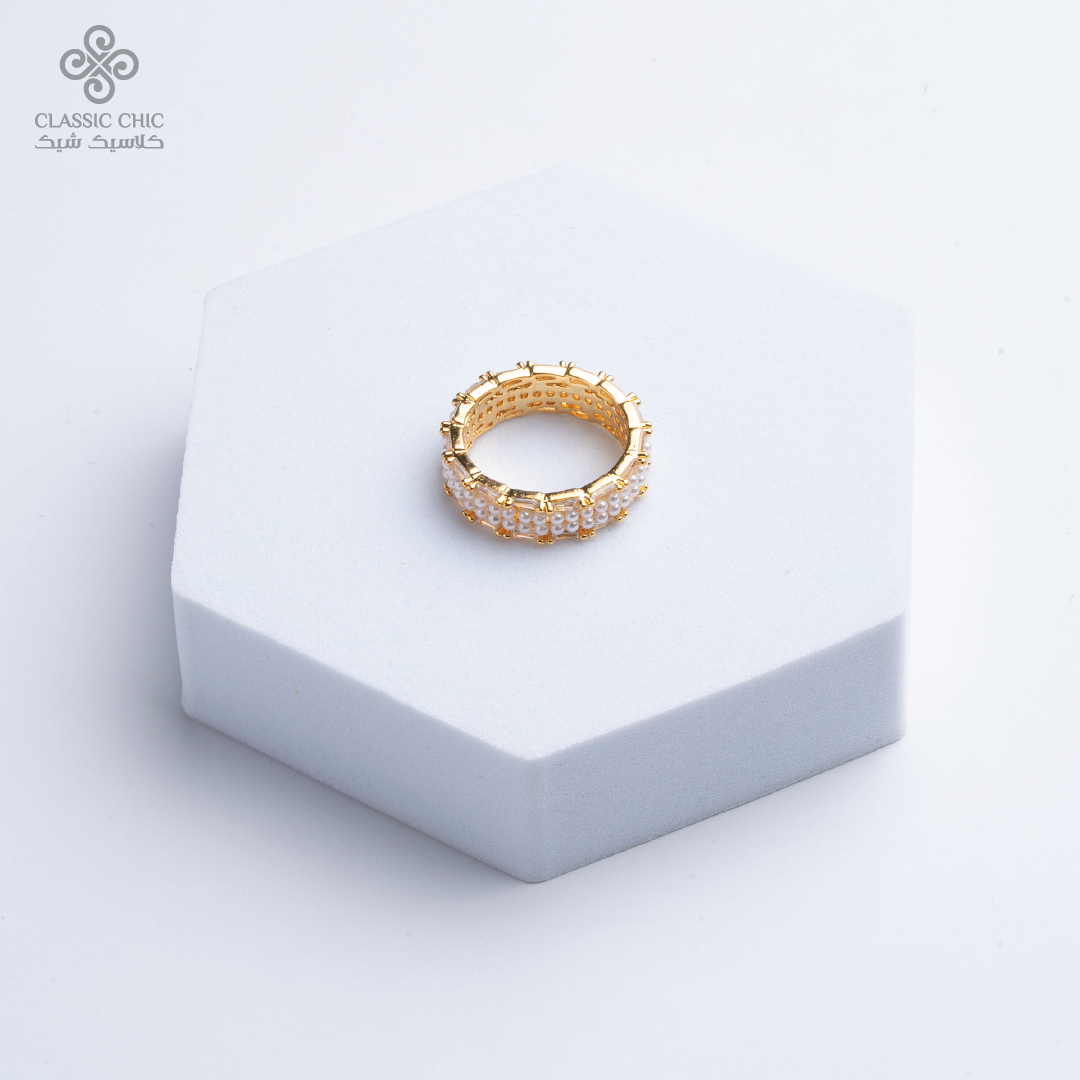 خاتم بتصميم أنيق يجمع صفوف اللؤلؤ مع أحجار شفافة بلمعة ناعمة تضيف لمسة فخامة راقية.
