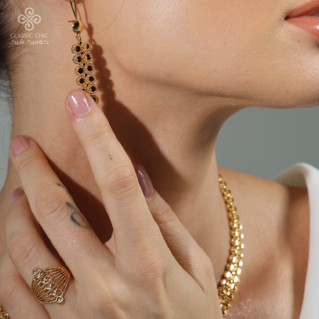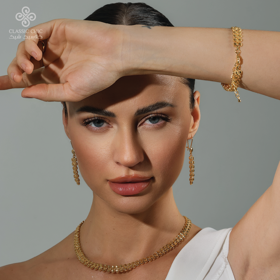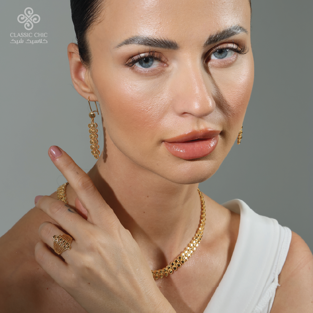 تميّزي بإطلالة تجمع بين الرقيّ والبساطة مع هذا الطقم الذهبي المذهل من كلاسيك شيك.