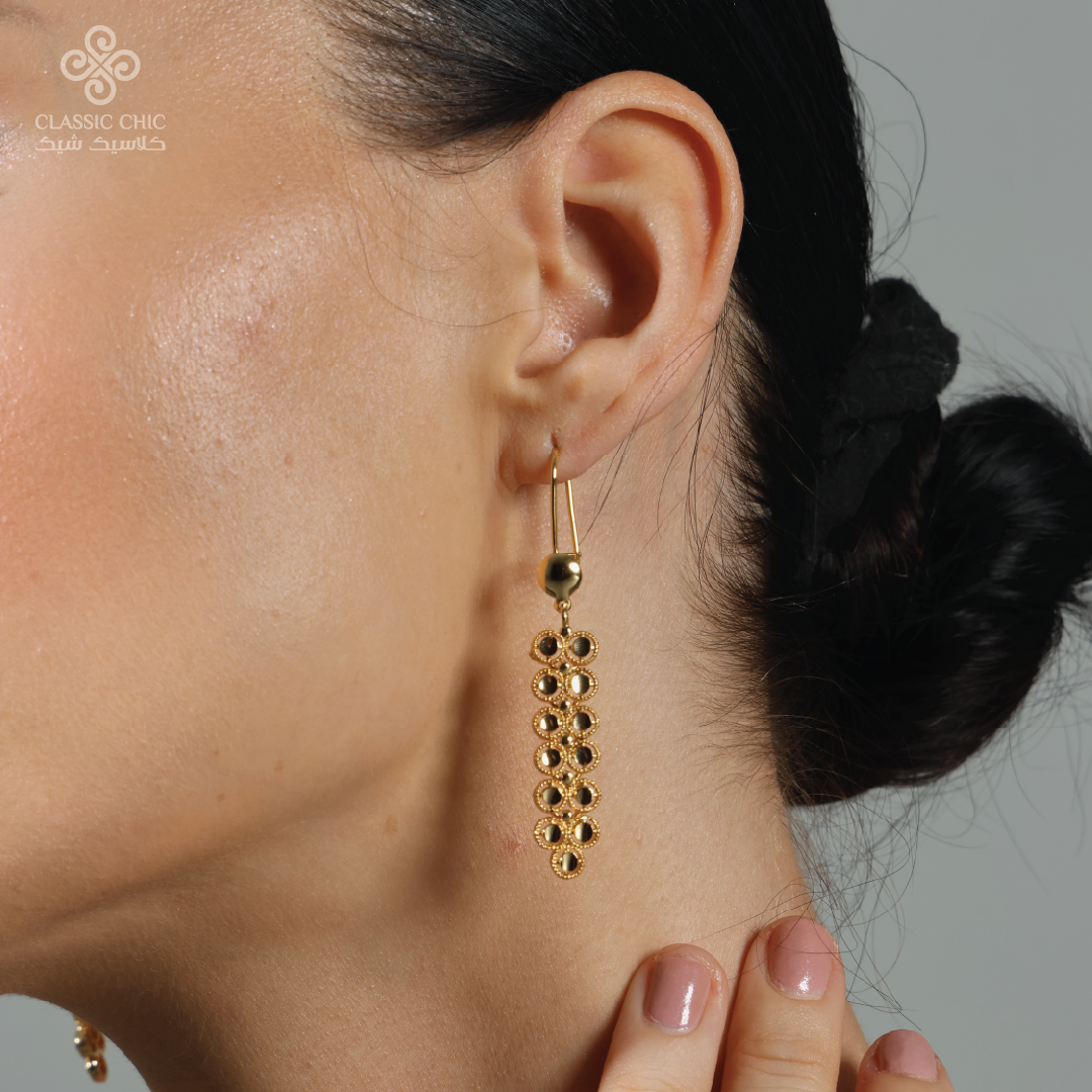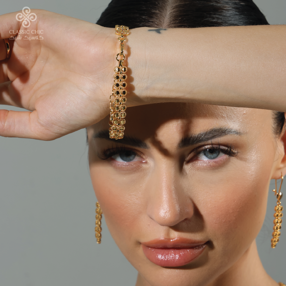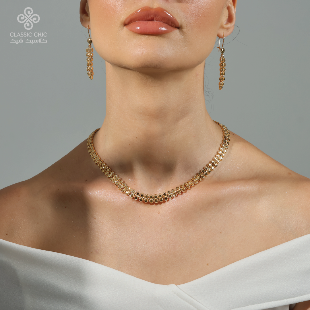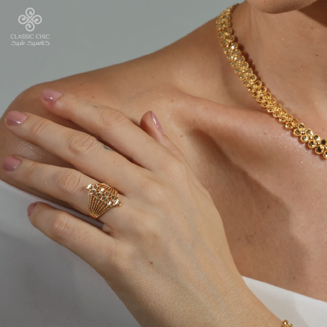 تميّزي بإطلالة تجمع بين الرقيّ والبساطة مع هذا الطقم الذهبي المذهل من كلاسيك شيك.