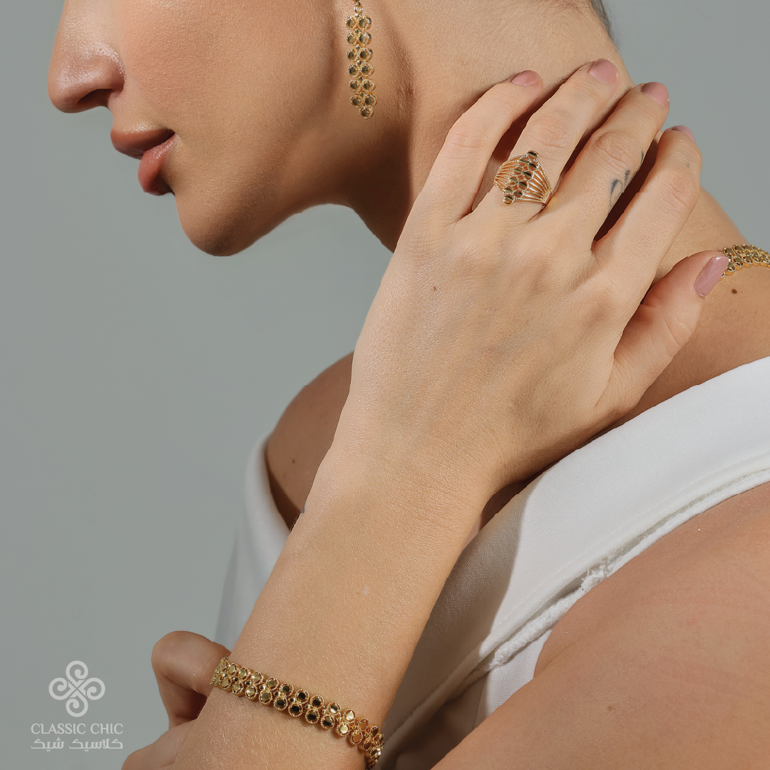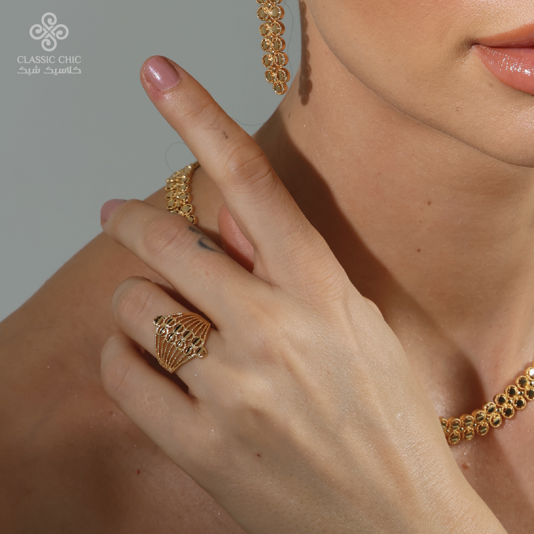 يتكوّن من عقد وسوار وأقراط وخاتم بتصميم هندسي متناسق يعكس لمعان الذهب بطريقة فريدة تأسر الأنظار.
